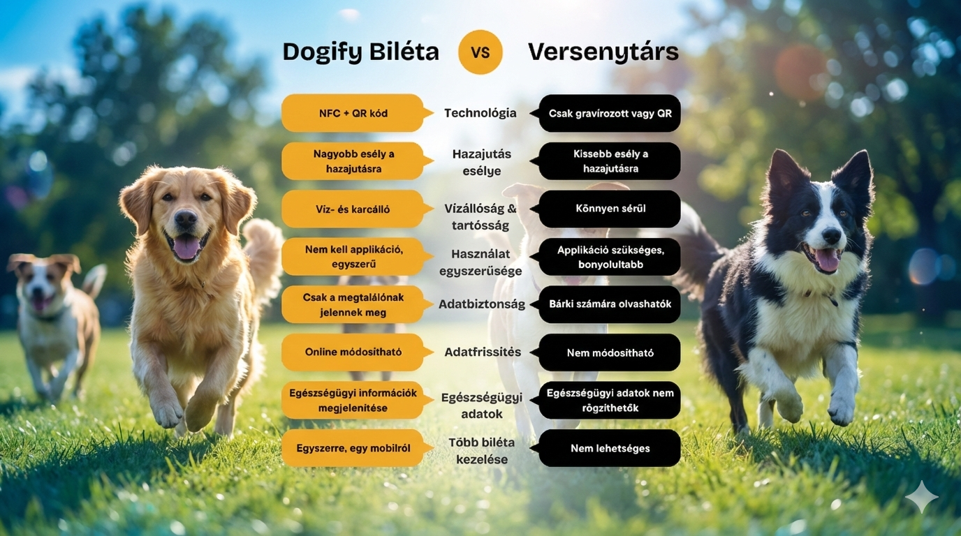 A Dogify biléta jól látható QR-kóddal és egy könnyen megjegyezhető webcímmel működik. Nem kell semmit letölteni: elég egy okostelefon, és a megtaláló azonnal megnyithatja kedvenced profilját. Így gyorsabban hazajut az állat, neked pedig kevesebbet kell aggódnod.